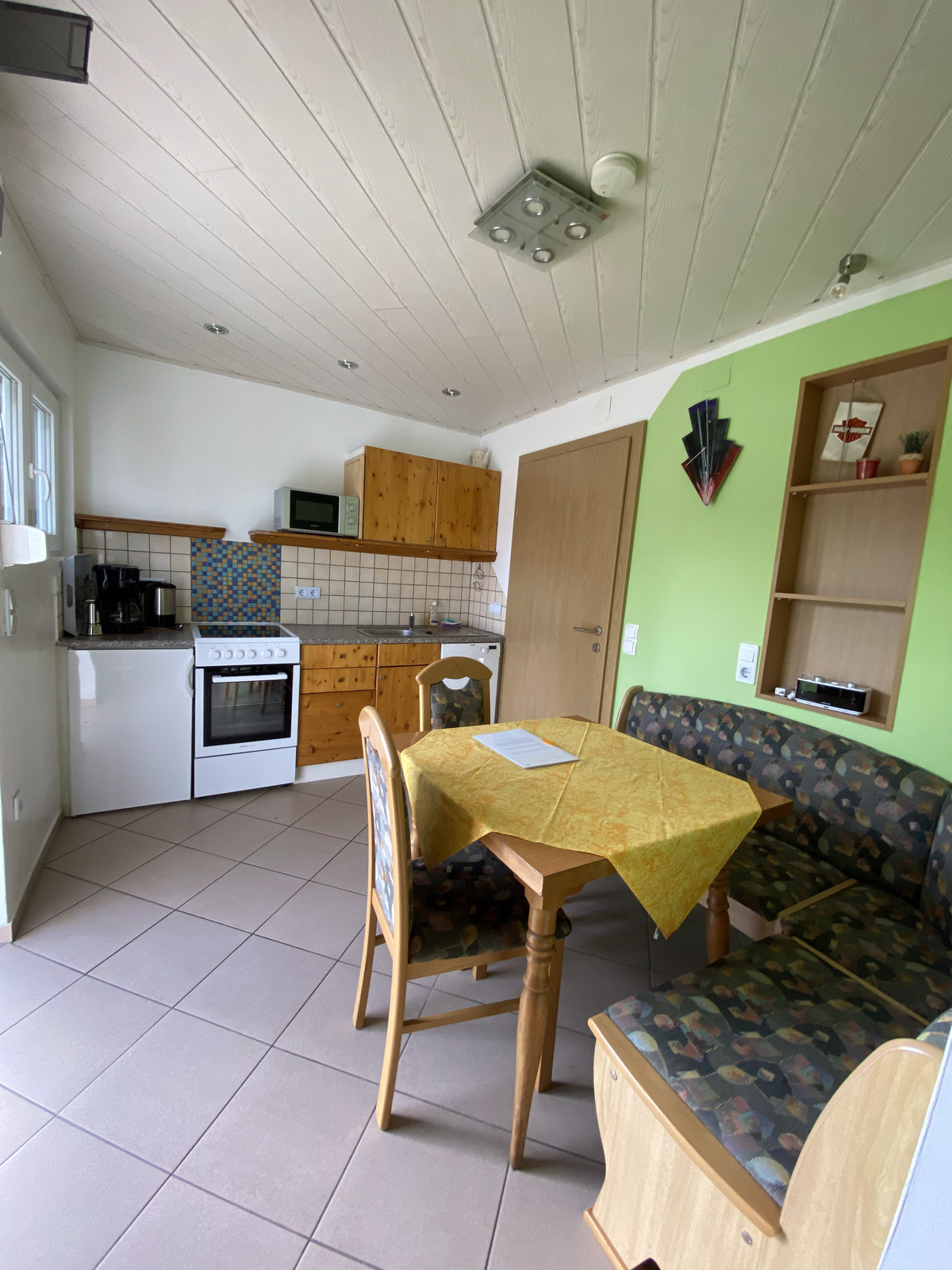 • Küche (voll ausgestattet mit Gläser, Kochtöpfe, Besteck, Kaffeemaschine (Filter), Mikrowelle, Herd (4 Kochfelder) und Backofen, Wasserkocher, Geschirrspüler